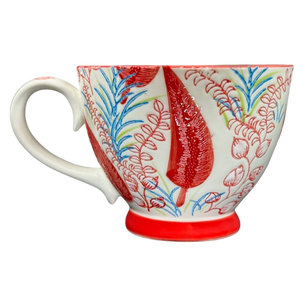 This mug sits on a matching red pedestal base.