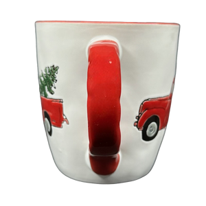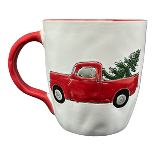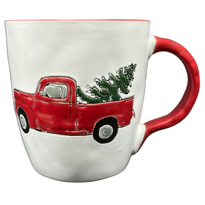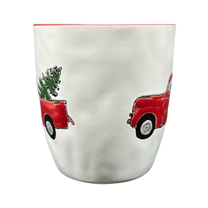 Features the same etched artwork on its front and rear surface depicting a red truck transporting a Christmas tree.
