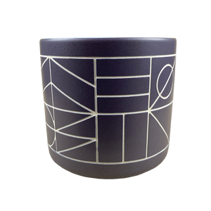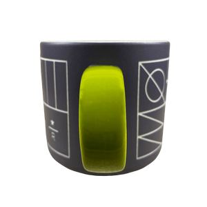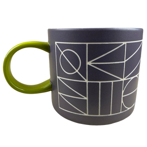This mug features an etched geometric art deco pattern wrapping around its exterior surface.