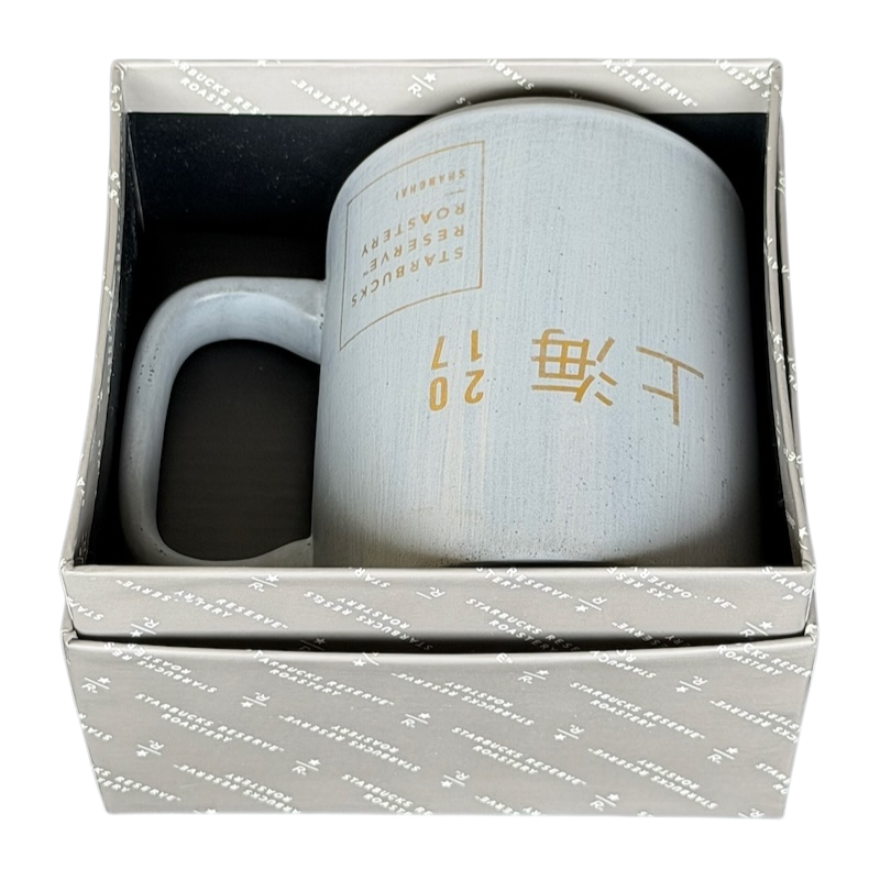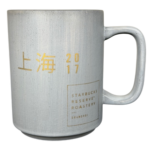 This elegant 12-ounce Starbucks Reserve Roastery Shanghai mug captures the refined aesthetic of the Reserve line with its smooth, smoky grey ceramic finish and understated gold lettering. The front features the Shanghai city name in Chinese characters alongside the year 2017, paired with the Starbucks Reserve Roastery Shanghai emblem in a clean, modern layout. Its straight-sided shape and squared handle create a contemporary profile that feels substantial and balanced in hand.