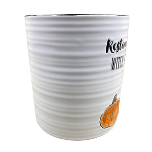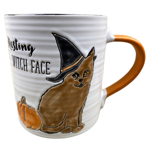 Features lightly embossed artwork on its front surface consisting of a cat wearing a witch hat with a pumpkin on the ground to its left.