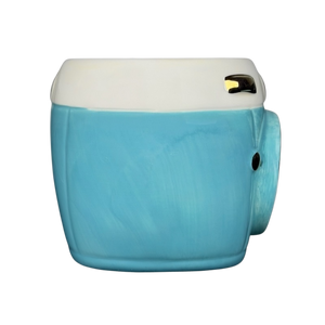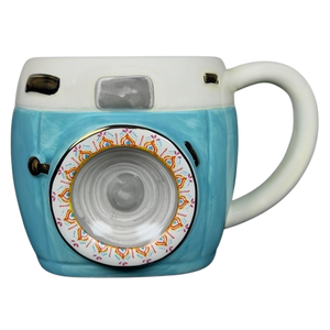 This whimsical ceramic mug is designed to look like a vintage camera, making it a fun and creative choice for coffee or tea lovers. The mug features a glossy light blue body with a cream-colored top and handle, accented by metallic gold details that resemble camera buttons and features. The “lens” area has a textured circular design with a colorful, mandala-style pattern around the edge, adding a touch of artistic flair. Perfect for photographers, creatives, or anyone who loves quirky mugs, this piece combines functionality with charm.