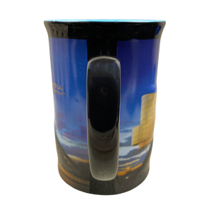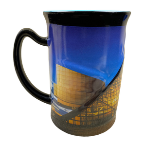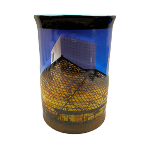 This is a beautiful mug that features the Rock And Roll Hall Of Fame + Museum in Cleveland, Ohio embossed into its exterior surface.
