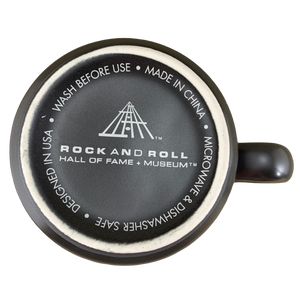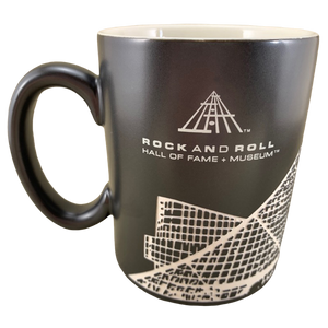 This is a beautiful mug that features the Rock And Roll Hall Of Fame + Museum in Cleveland, Ohio etched into its exterior surface.
