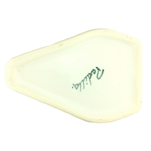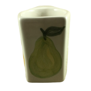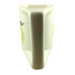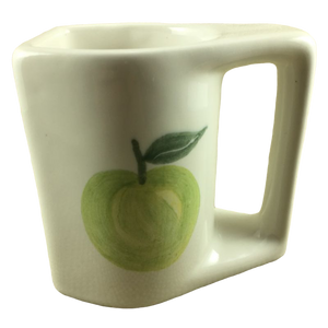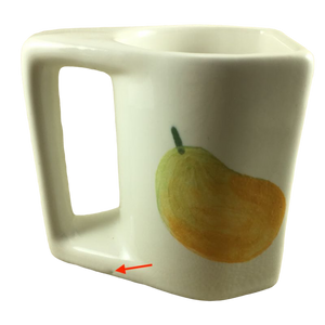 Rodolfo Padilla is known for this specific style of mug. It's an unusual design with a round shape but one side is flat. On all 3 rounded sides there is a different piece of fruit artwork.