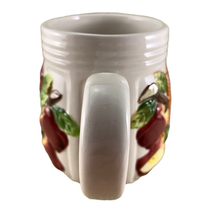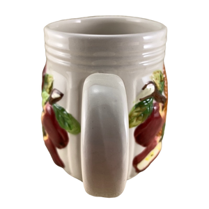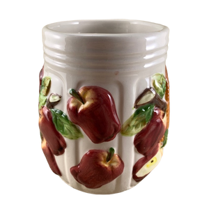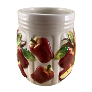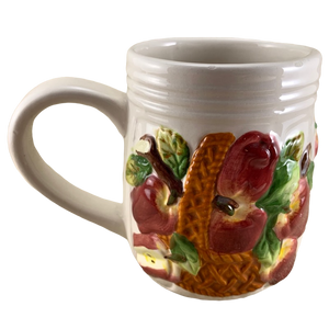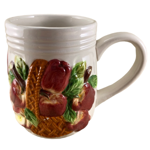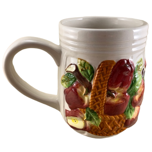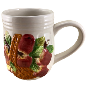 Features embossed artwork on its front and rear surface depicting apples in a basket.