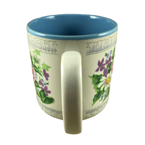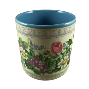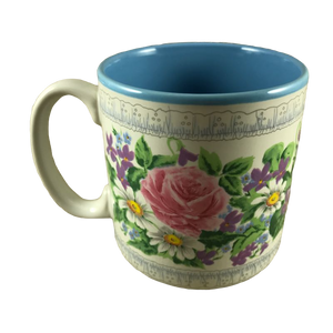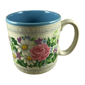 Features an assortment of roses and sunflowers over the majority of the exterior of the mug.