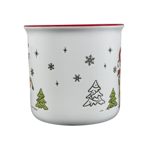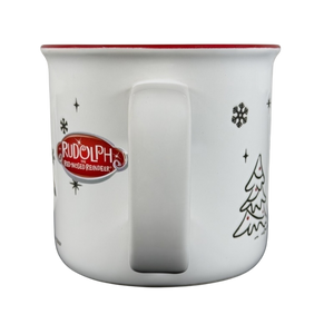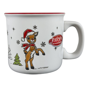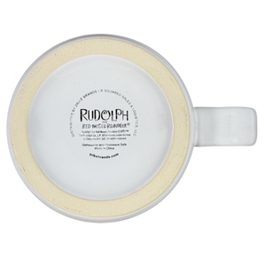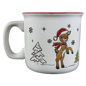 This mug features lightly etched artwork. It depicts Rudolph The Red Nosed Reindeer rearing and wearing a Santa hat and scarf.