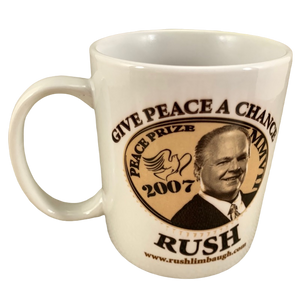 On the rear surface is a photo of Rush Limbaugh with "GIVE PEACE A CHANCE" printed above him and "RUSH" printed below. Underneath this is a web site address: