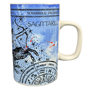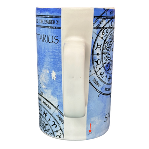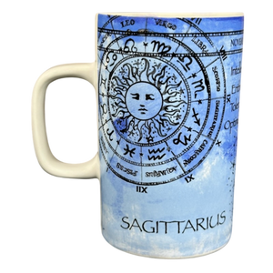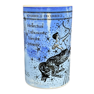 Features artwork relating to the Zodiac sign SAGITTARIUS wrapping around its exterior surface.