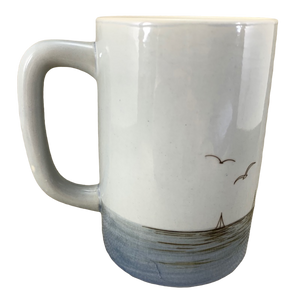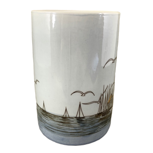 Features artwork consisting of sailboats docked at a boathouse with seagulls flying overhead wrapping around its exterior surface.