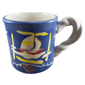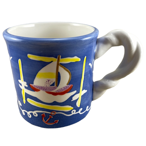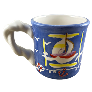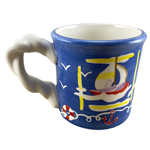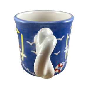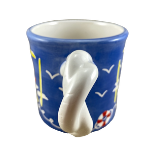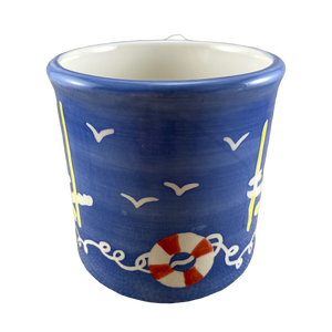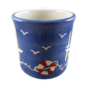 Features artwork wrapping around its exterior surface consisting of sailboats in the water, birds, and life preservers.