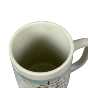 Features artwork wrapping around its exterior surface depicting a large sailing ship on the water with a lighthouse in the distance.