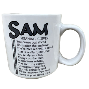 Features the name SAM printed in a large font at the top of the front side of the mug.