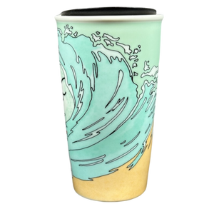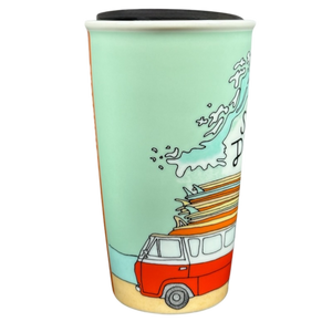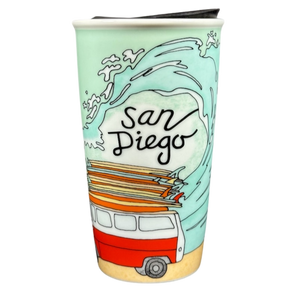 This tumbler features an image of a VW bus with many surfboards on its roof and "San Diego" written in a cursive font above it.