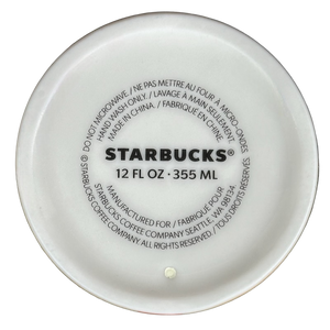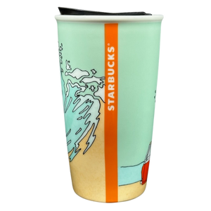 "STARBUCKS" is printed vertically in a white font within an orange stripe on the surface opposite the VW bus.