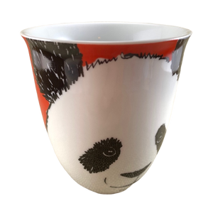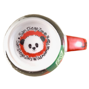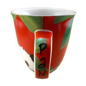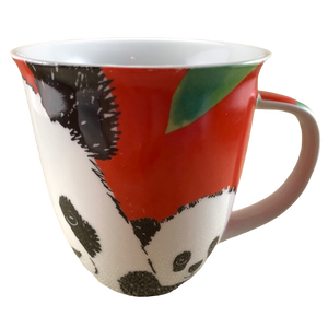 The handle is colored to match the background on the rest of the mug and has "Panda" printed vertically on it.