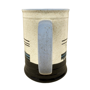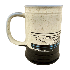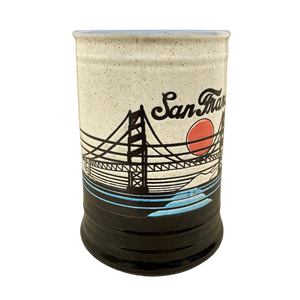 This is a large and heavy vintage mug that features the Golden Gate Bridge with the sun behind it etched into its exterior surface.