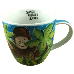 Features whimsical artwork wrapping around the exterior surface consisting of an ape standing between trees and smiling.