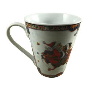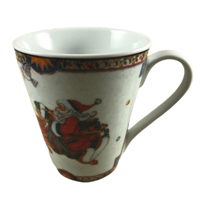 Features the same image on the front and the rear of Santa Claus riding on a reindeer.
