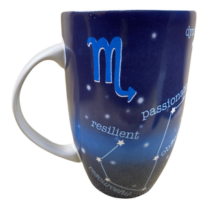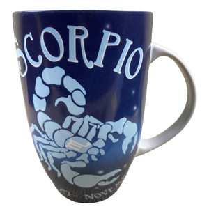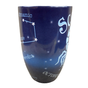 This is a tall mug that features artwork on its front and rear surface depicting the Zodiac sign SCORPIO.