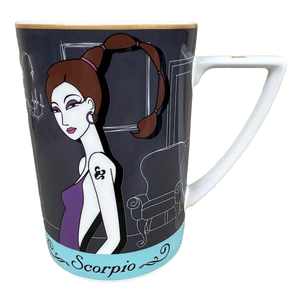 Features an image of a woman with a scorpion tattoo on her upper arm and hair shaped like a scorpion's tail on its front surface.