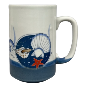 Features lightly embossed artwork wrapping around its exterior surface depicting seashells, a starfish, and sand dollars.