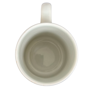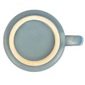 NOTE: In the 360 photo, this mug slightly reflects the spinning surface that it is being photographed on. This results in a reflection which appears as a dark line in the middle of the lower blue portion. This coloration is not actually present on the mug.