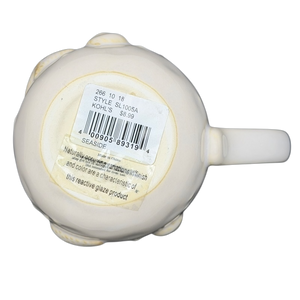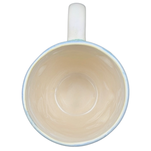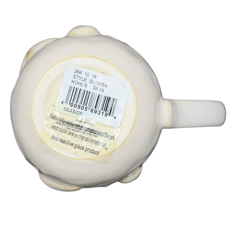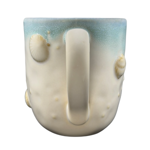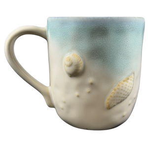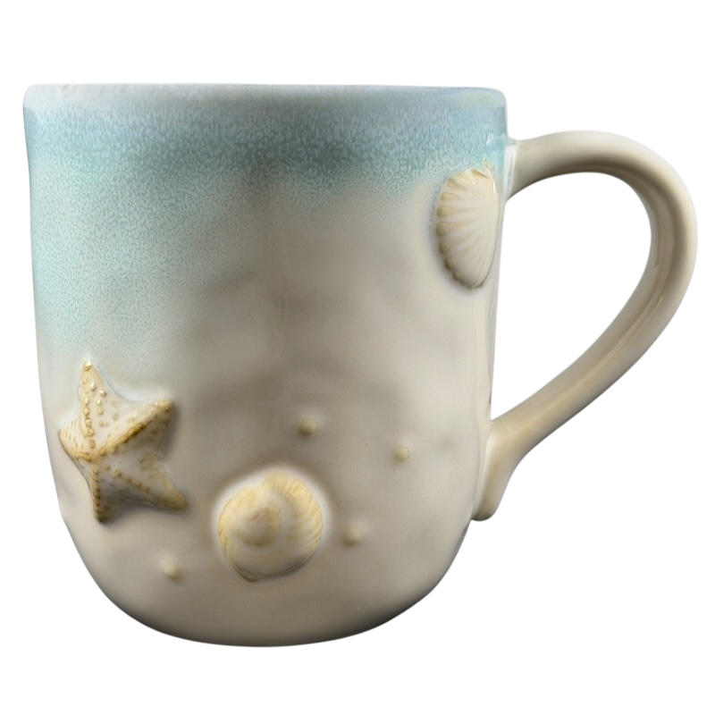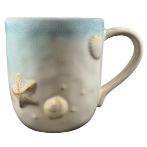 This mug showcases detailed embossed 3D seashells and starfish on the outer surface. Its design highlights a blend of blue and beige shades, with subtle variations in each piece. Refer to the images closely to view the specific mug you will receive.