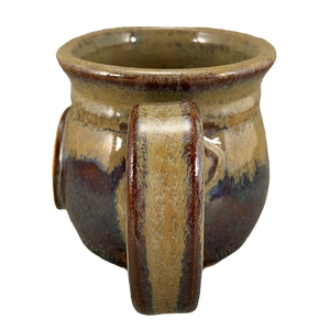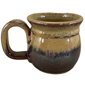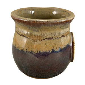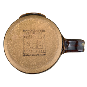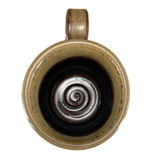 This is a gorgeous pottery style mug that features a raised circular area on its front surface that has an etched image on it. I am uncertain what the etched image is. It might be a map of some sort, there are also etched flowers beneath it.