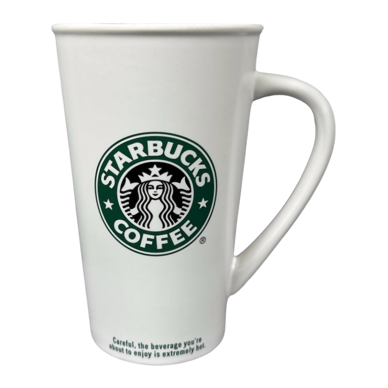 This tall 20-ounce Starbucks mug captures the classic look of the brand with a clean, iconic café-inspired design. The front features the well-known green Starbucks Coffee siren logo, boldly centered on a matte white background that mimics the style of the company’s traditional store cups. Its slender, tapered body transitions gracefully into a flared rim, while the elongated curved handle adds both comfort and an elegant silhouette.
