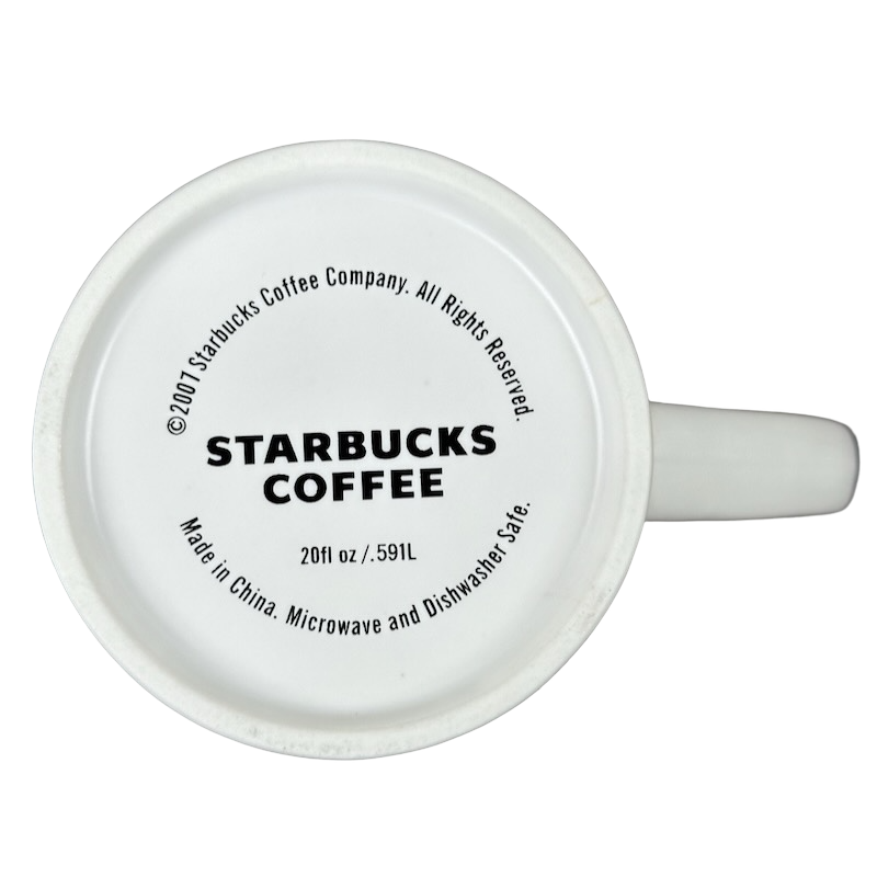 The back includes the standard Starbucks drink-customization boxes, giving the mug an authentic barista feel. A safety warning printed along the base mirrors the message found on Starbucks’ paper cups, reinforcing the café aesthetic. The bottom stamp identifies this as an official 2007 Starbucks release, crafted in China and fully microwave- and dishwasher-safe for everyday convenience.