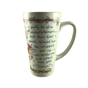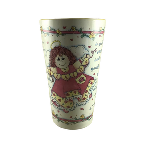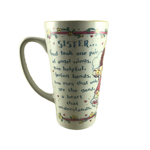 Features an image of an angel holding the word sister. Each letter in sister is inside a heart shape on a string.