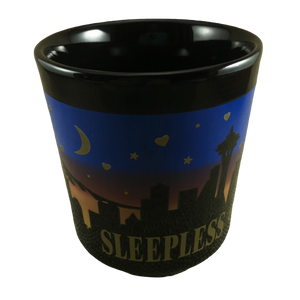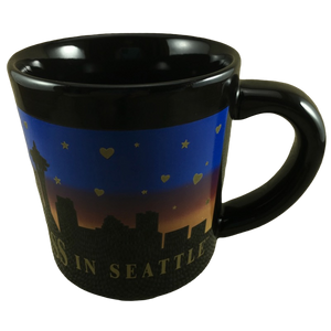 Artwork wrapping around this mug depicts a nighttime view of the Seattle skyline.