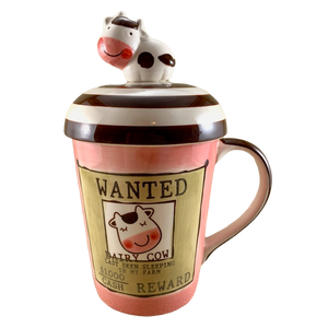 Features a whimsical image of a smiling cow on its front surface. The cow is on a WANTED poster with a cash reward.