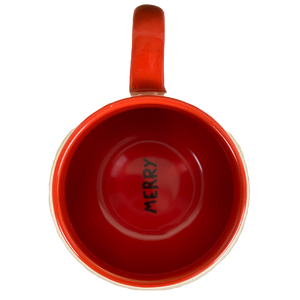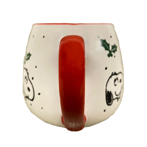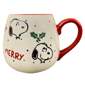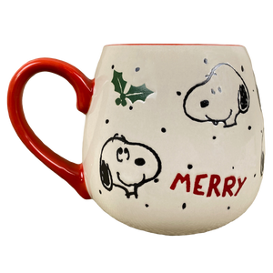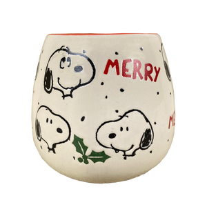 Features lightly etched artwork wrapping around its exterior surface consisting of a repeating pattern of Snoopy, holly, and the word "MERRY."