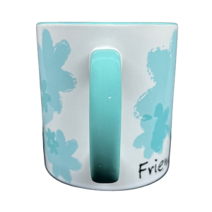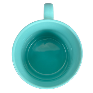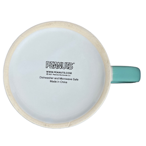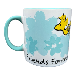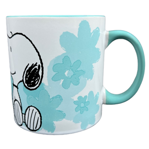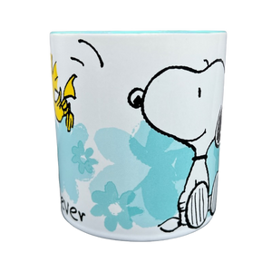 This larger than average mug features Snoopy and Woodstock on its exterior surface with blue flowers in the background.