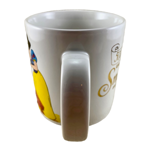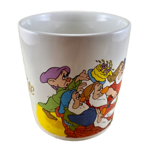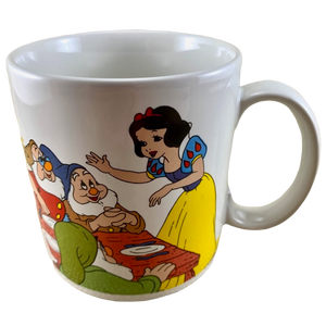 Features Snow White And The Seven Dwarfs on its front surface. The dwarfs are sitting at a table and listening to Snow White.