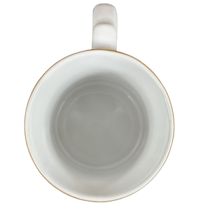 There is gold trim wrapping around the rim and base and on the sides of the handle.