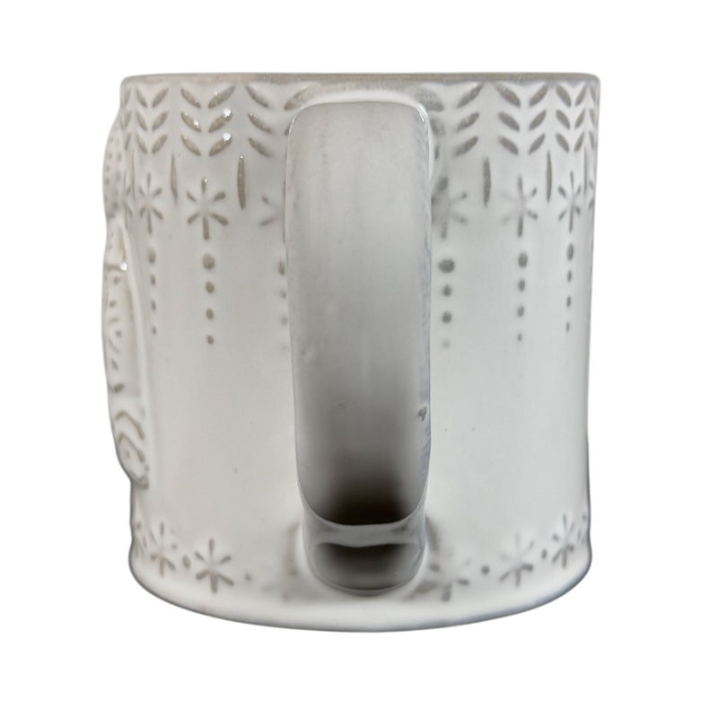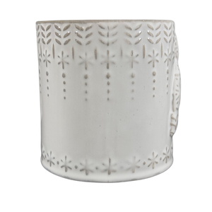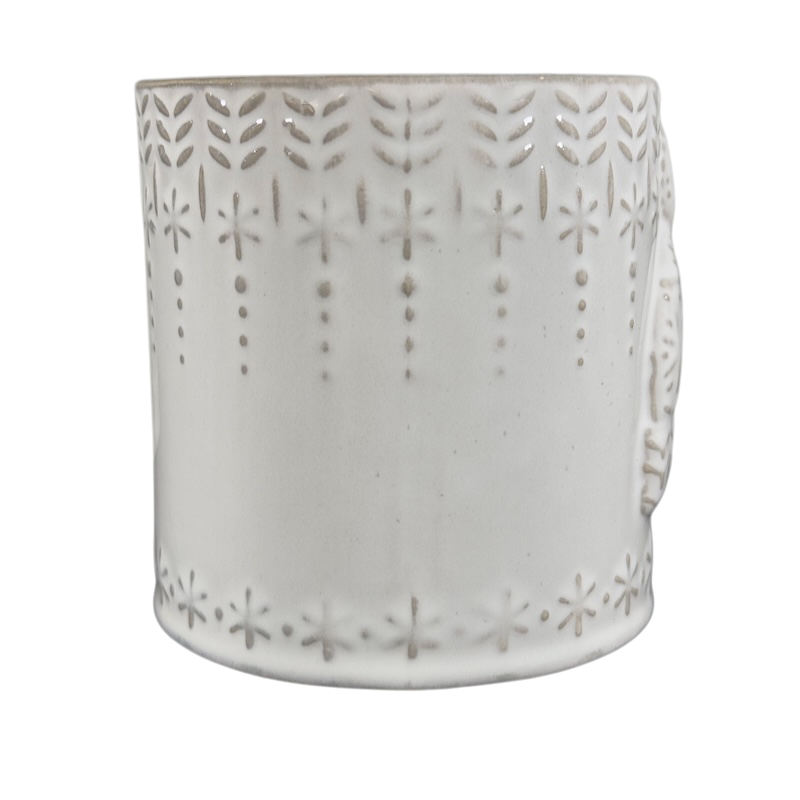 There is a ring of embossed trim made up of snowflakes and other shapes that wraps around the exterior upper and lower surface.