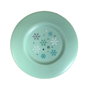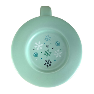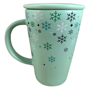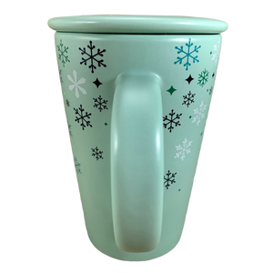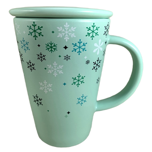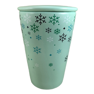 Features green, black, and white snowflakes wrapping around its exterior upper surface and on top of the matching lid.