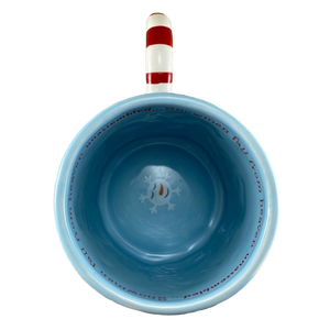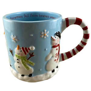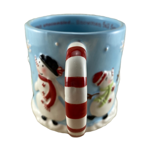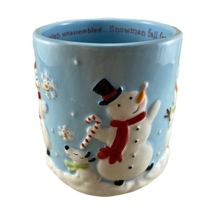 Features embossed artwork depicting snowmen, snowflakes, and a dog wrapping around its exterior surface.