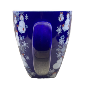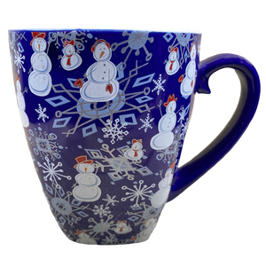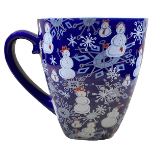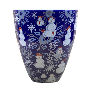 Features snowmen and snowflakes wrapping around its exterior surface.