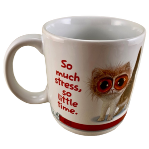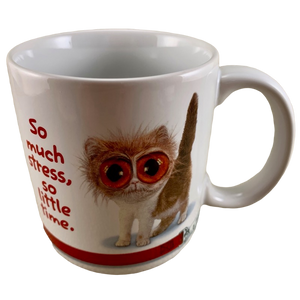 Features the same artwork on its front and rear surface depicting a cat with enormous eyes and the following printed in a red font to its left: