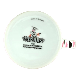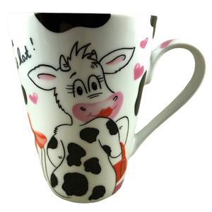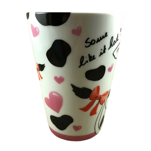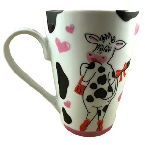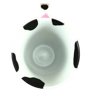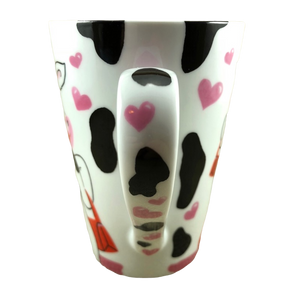 Wrapping around the exterior surface and continuing slightly inside the mug are black cow spots. There are also pink hearts wrapping around the exterior but they don't continue to the inside of the mug.