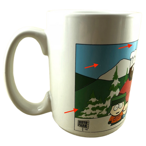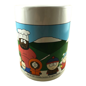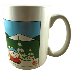 Features an image of South Park characters standing in front of a snow capped mountain on its front exterior surface.