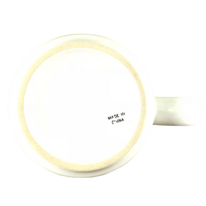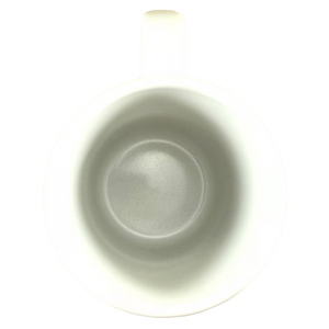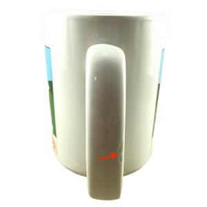 Condition note: there is a small nick on the rear upper surface and 2 other much smaller blemishes. Please see the red arrows pointing to these in the 3rd photo. On the right edge of the handle there are 2 small spots where the white paint did not cover the underlying ceramic material. These spots are glazed over so clearly it is a manufacturing imperfection and not damage. Please see the 2nd photo where a red arrow is pointing to these 2 spots. Inside this mug its bottom surface has a lightly speckled appearance, please see the 5th photo for a look at this.