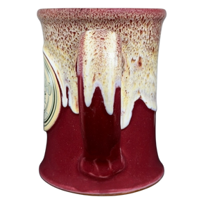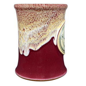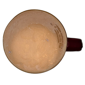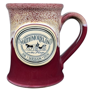 This handsome stoneware mug features rich maroon glaze paired with a warm, creamy drip finish that cascades organically from the rim, creating a cozy lodge-style look with beautiful depth and texture. The front medallion reads “Southmoreland on the Plaza – An Urban Inn,” adding a distinctive destination appeal, while the gently flared shape and substantial handle provide a comfortable, well-balanced feel in hand. Finished with the same rich maroon glaze on the interior and an impressed base stamp indicating it was handcrafted by Deneen Pottery in 2010, this mug is a collectible and functional piece that blends artisan craftsmanship with classic hotel-style charm.