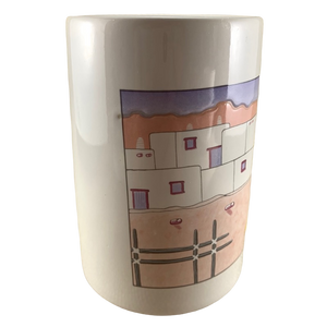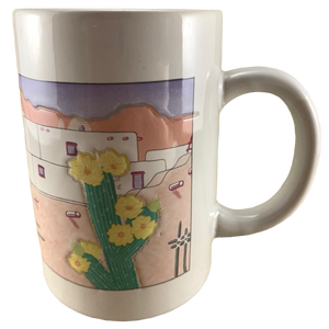 It features beautiful lightly embossed artwork on its front surface depicting a Southwest scene with yellow flowers on a cactus and an adobe village in the background.