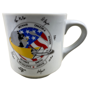 Features the mission patch from STS-51-L on its front surface with the signatures of the astronauts surrounding it.